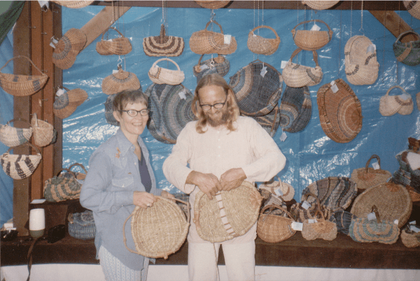 Some of you may recognize the t-shirt Marlene’s wearing in this photo. It says “Basket Maker Basket Maker.” Looking at her shirt inspires me to share another picture. This one is from 30 years ago. Ron and Marlene are selling their baskets at a fair. Look at those young kids!